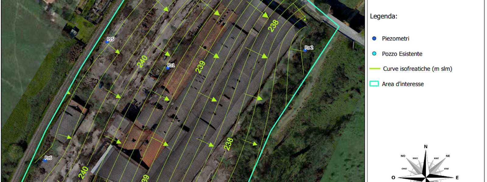 Il rilievo topografico è stato effettuato tramite il rilievo a mezzo SAPR Mavic Enterprise 3T in modalità RTK (Real Time Kinematic) con lo scopo di conoscere istantaneamente la posizione del punto a terra battuto. Il rilievo a mezzo SAPR è stato agganciato a terra mediante GCP battuti tramite un’antenna ricevitore GNSS, Stonex S700A, anch'essa in modalità RTK. Sono state ottenute perciò le coordinate x e y di ciascun piezometro, pozzo realizzato e presente nell’area di interesse e in generale di ciascun pixel dell'ortomosaico; per quanto concerne la coordinata z, il valore altimetrico viene restituito come quota s.l.m. grazie all'implementazione nel rilievo del relativo grigliato acquistato dall'Istituto Geografico Militare. Per i piezometri rilevati è stato posizionato lo strumento alla testa del tubo in PVC misurando quindi la quota del boccapozzo. Una volta eseguite le misurazioni freatimetriche, mediante apposito strumento, vengono utilizzati i valori raccolti relativi alla quota di falda sul livello del mare all’interno del software Surfer. Questo software è un potente strumento di modellazione 3D che incorpora varie funzionalità e che può essere utilizzato in campi estesi, dalla modellazione batimetrica, all'analisi della superficie, alla mappatura dei contorni, alla mappatura 3D della superficie o alla modellazione del terreno. Nel caso in esame ci ha permesso di elaborare una mappa di isofreatiche, ovvero linee in cui si trovano i punti di uguale quota assoluta della superficie freatica; tale operazione ha permesso di individuare la direzione del flusso idrico sotterraneo, che per definizione è perpendicolare alle curve di livello in quanto il movimento delle acque avviene lungo la direzione di massima pendenza per quanto riguarda le falde freatiche, e dai punti a maggiore pressione ai punti a minor pressione nelle falde artesiane.