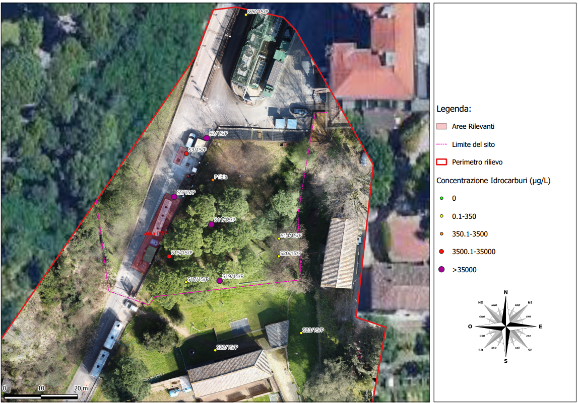 Il rilievo aerofotogrammetrico è stato affiancato ad un rilievo condotto con strumento GNSS (Global Navigation Satellite System) differenziale, il quale ha permesso di ubicare con precisione centimetrica le verticali di indagine tramite le coordinate Est e Nord e di avere la quota del boccapozzo dei piezometri. Attraverso il software open source QGis è possibile discriminare visivamente le verticali, su cui sono stati in precedenza prelevati campioni di falda, in base alla concentrazione rilevate in laboratorio di un determinato parametro o contaminante (ad esempio idrocarburi).